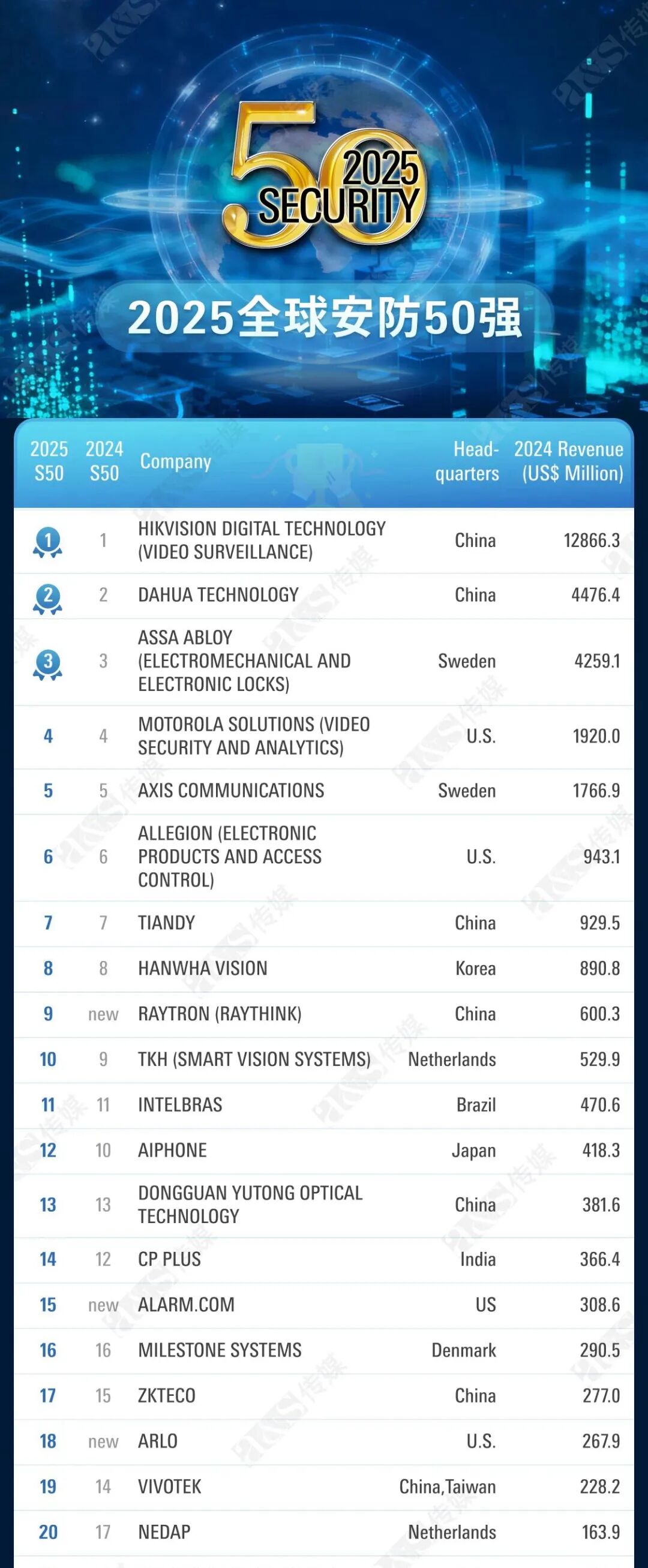剛剛,法蘭克福a&s正式發(fā)布“2025全球安防50強”榜單。天地偉業(yè)憑借扎實的技術(shù)能力、穩(wěn)健的市場表現(xiàn)、卓越的品牌影響力,位列全球安防50強第七名。